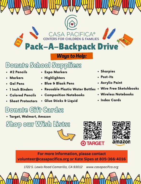 Outreach and Community Partnerships Helping Kids of Casa Pacifica Fill backpacks for Back-to-school. Collection runs until August 31.